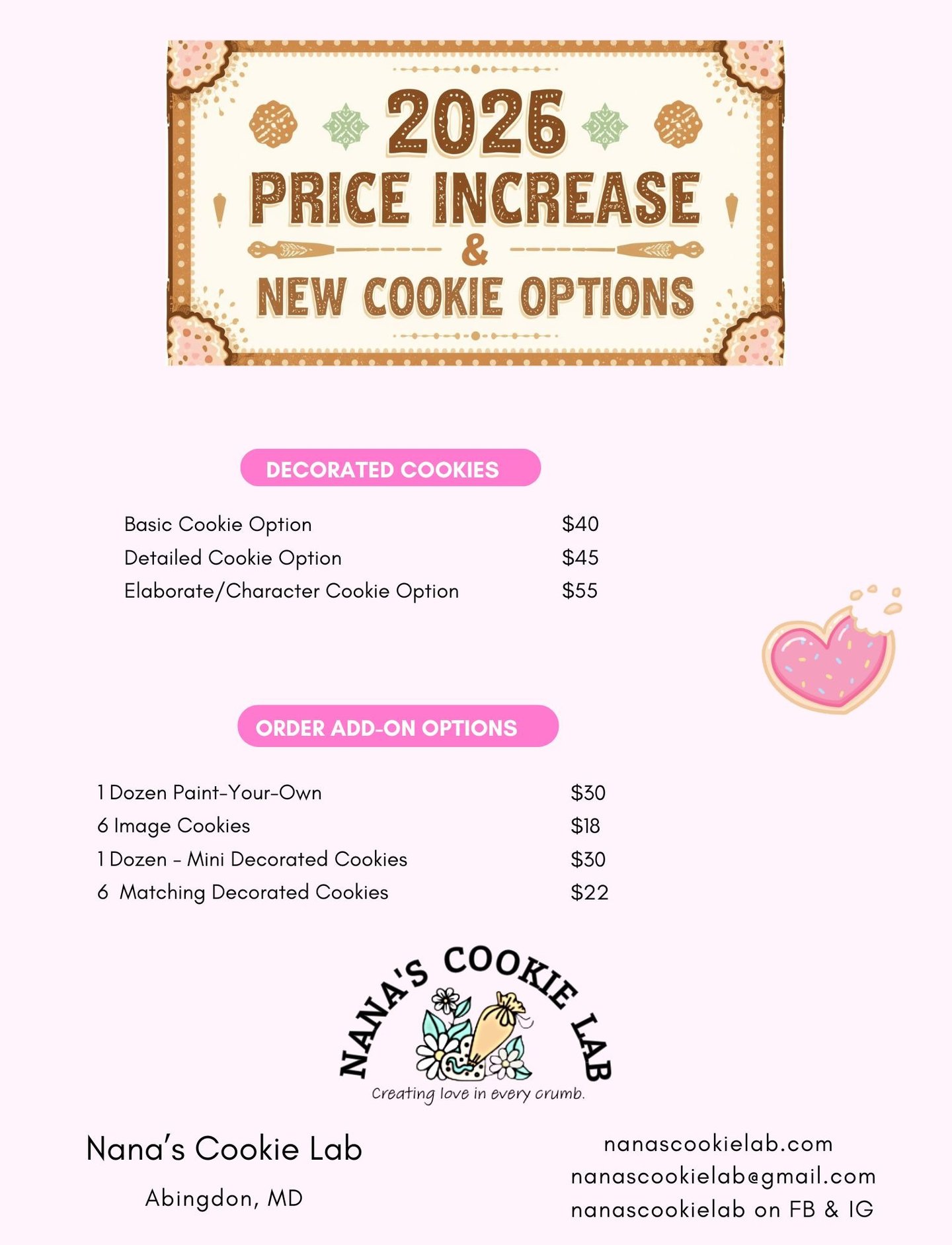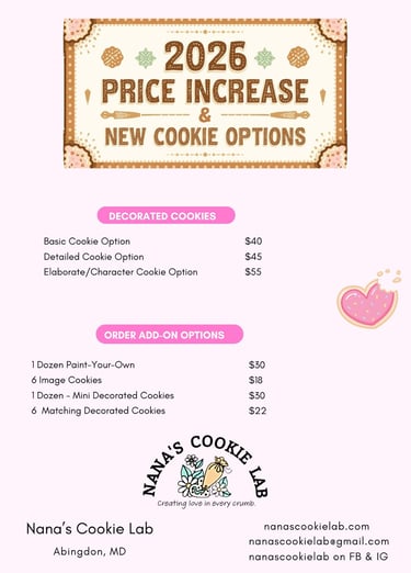 There will be a slight price increase to our Custom Decorated Cookies. Along with the slight increase there is also new fun add on options that you can choose from.